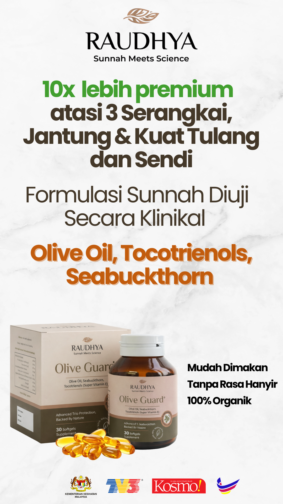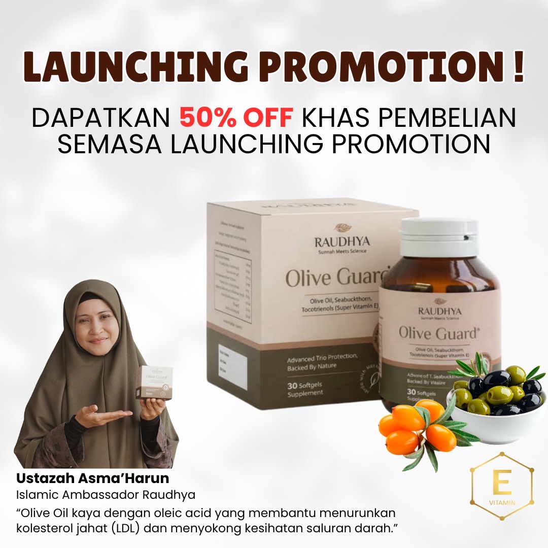 Raudhya OliveGuard+ Diperkaya Bahan Aktif Polyphenols, Tocotrienols (Super Vitamin E) & Omega Aktif Menyokong Kawalan Gula, Kolesterol & Tekanan Darah